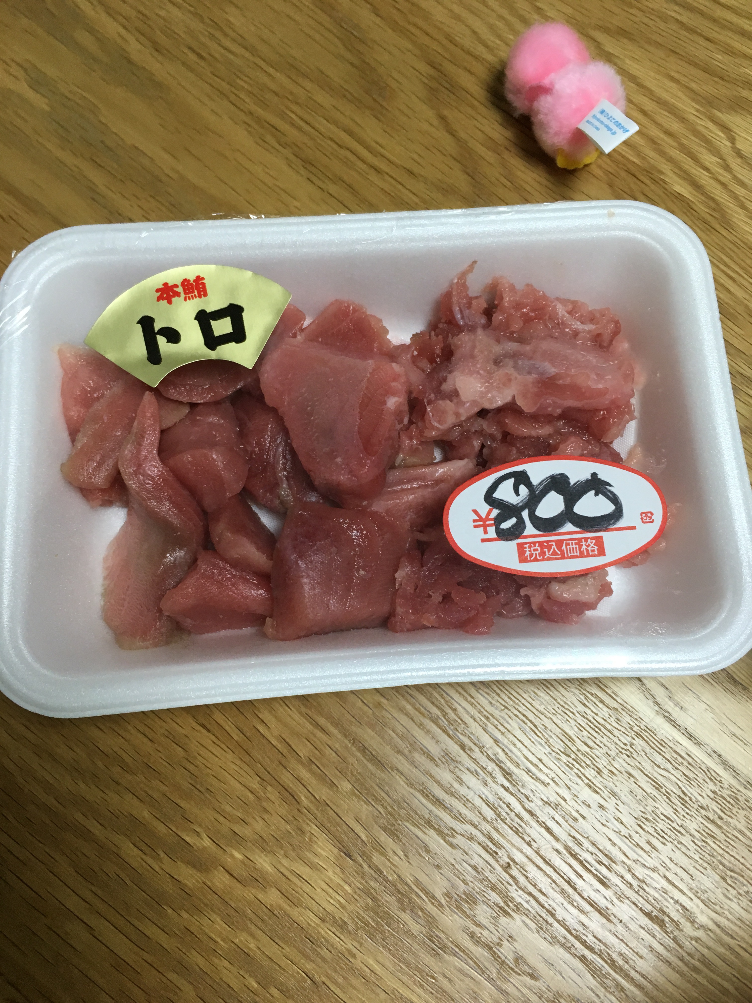 トロの切り落としを少しとマグロのホホ肉を4切れ買いましたよ。ホホ肉は4枚で600円でした。ステーキにしてバターソースで美味しく頂きました!